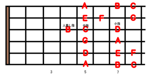 3弦の指使い以外は、5フレットは人差し指、6フレットは中指、7フレットは薬指、8フレットは小指がそれぞれ受け持って演奏します。